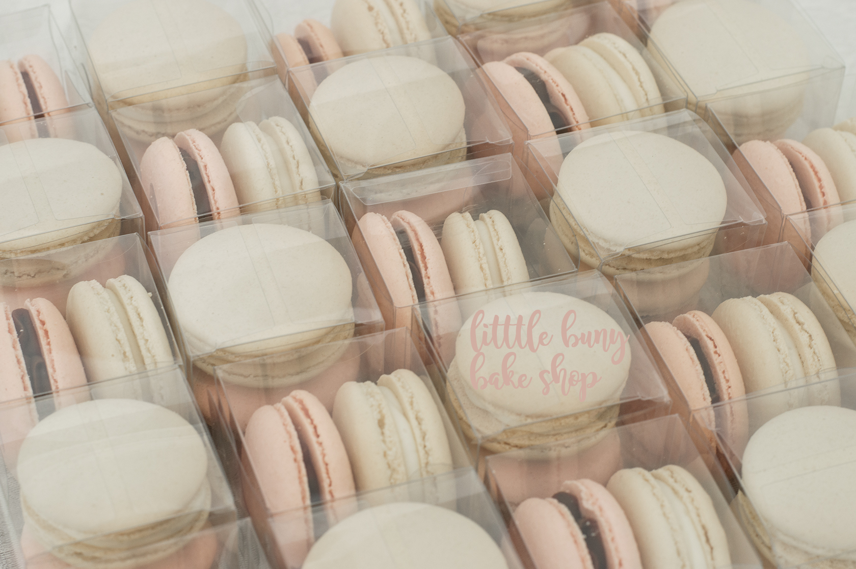 Giftable clear boxes hold 2 macarons/ package. Minimum order of 6 boxes, 2 flavours. Discount for larger orders.