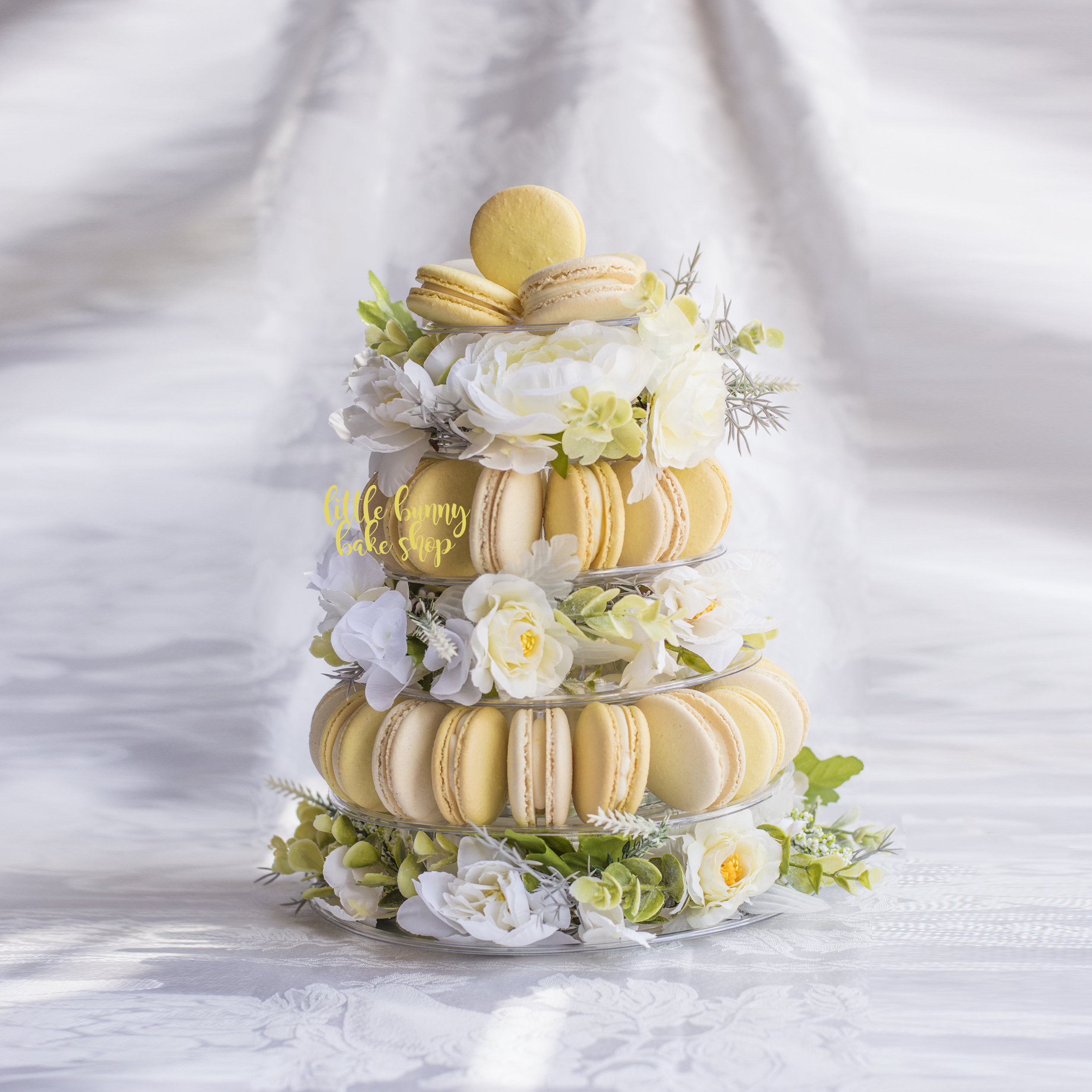 a)40 macarons up to 4 colours and 4 fillings. 6 tier macaron tower with florals incl. $150. b) 80 macarons 6 tier tower incl. max 5 colours and fillings $200.00. Wrapped and ready to serve.