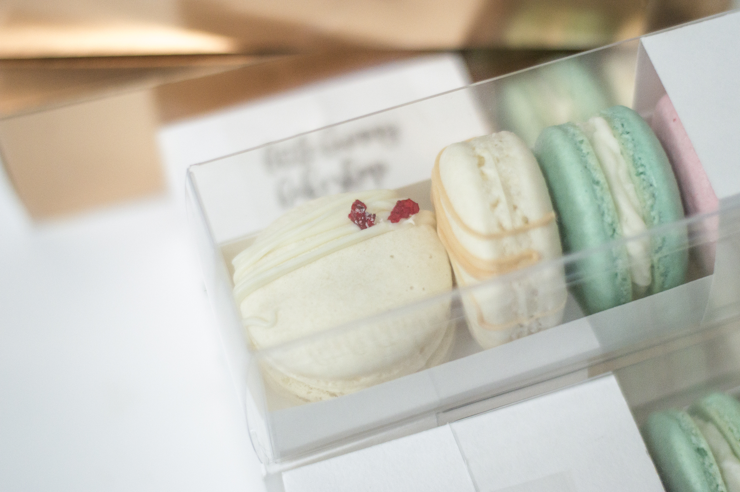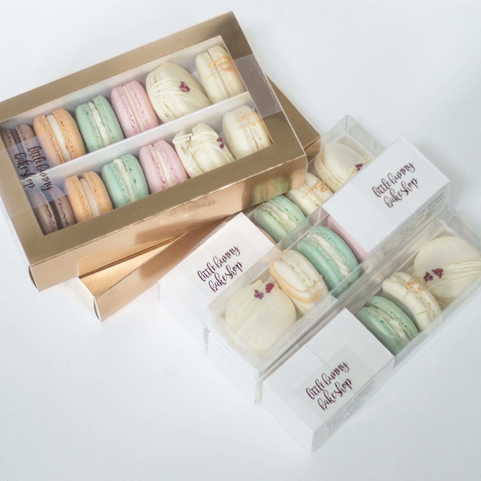 Giftable clear boxes hold 2 macarons/ package. Minimum order of 6 boxes, 2 flavours. Discount for larger orders.