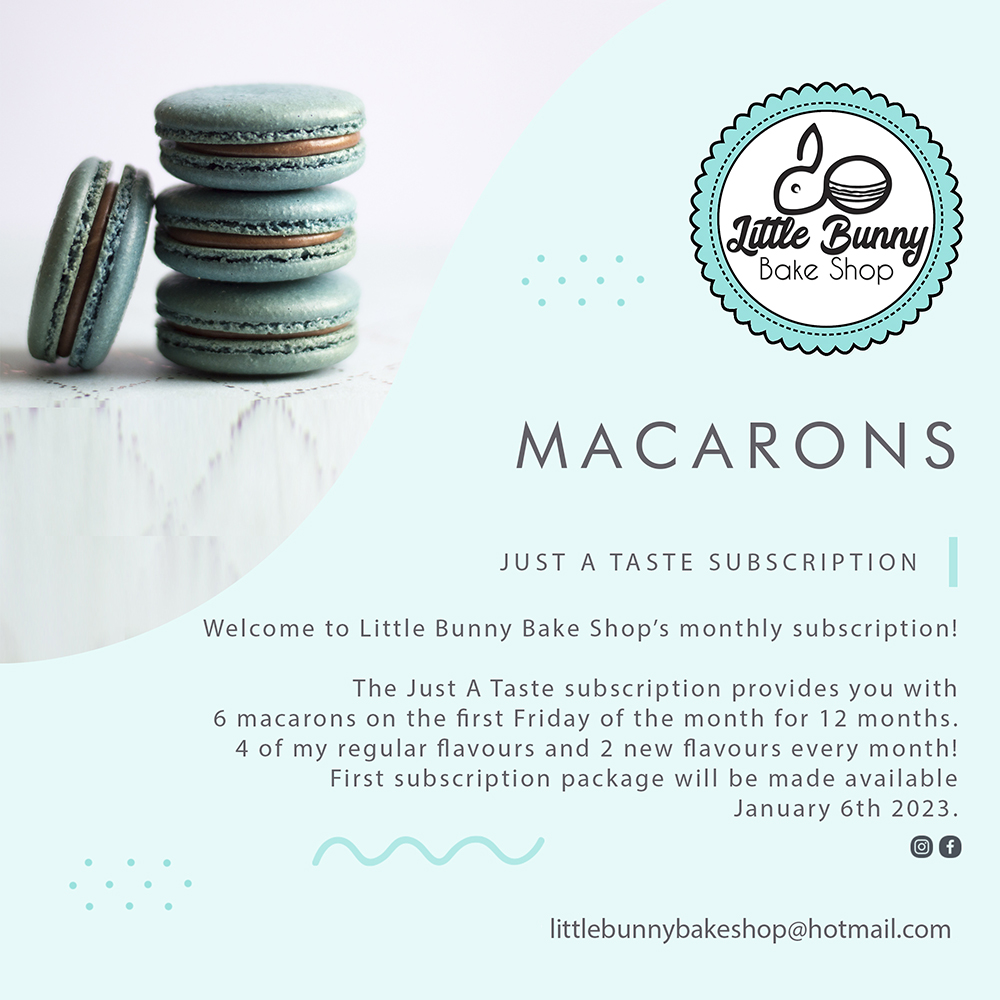 This subscription package includes 8 macarons in 4 of my classic flavours, and 4 macarons in that months 2 New flavours. An exclusive deal only for you! For every additional order over $30 you make through the year, you get 10% off! As with the Just the Taste orders will be made available for pick up or delivery on the first Friday of the month for 12 months from subscription start date!